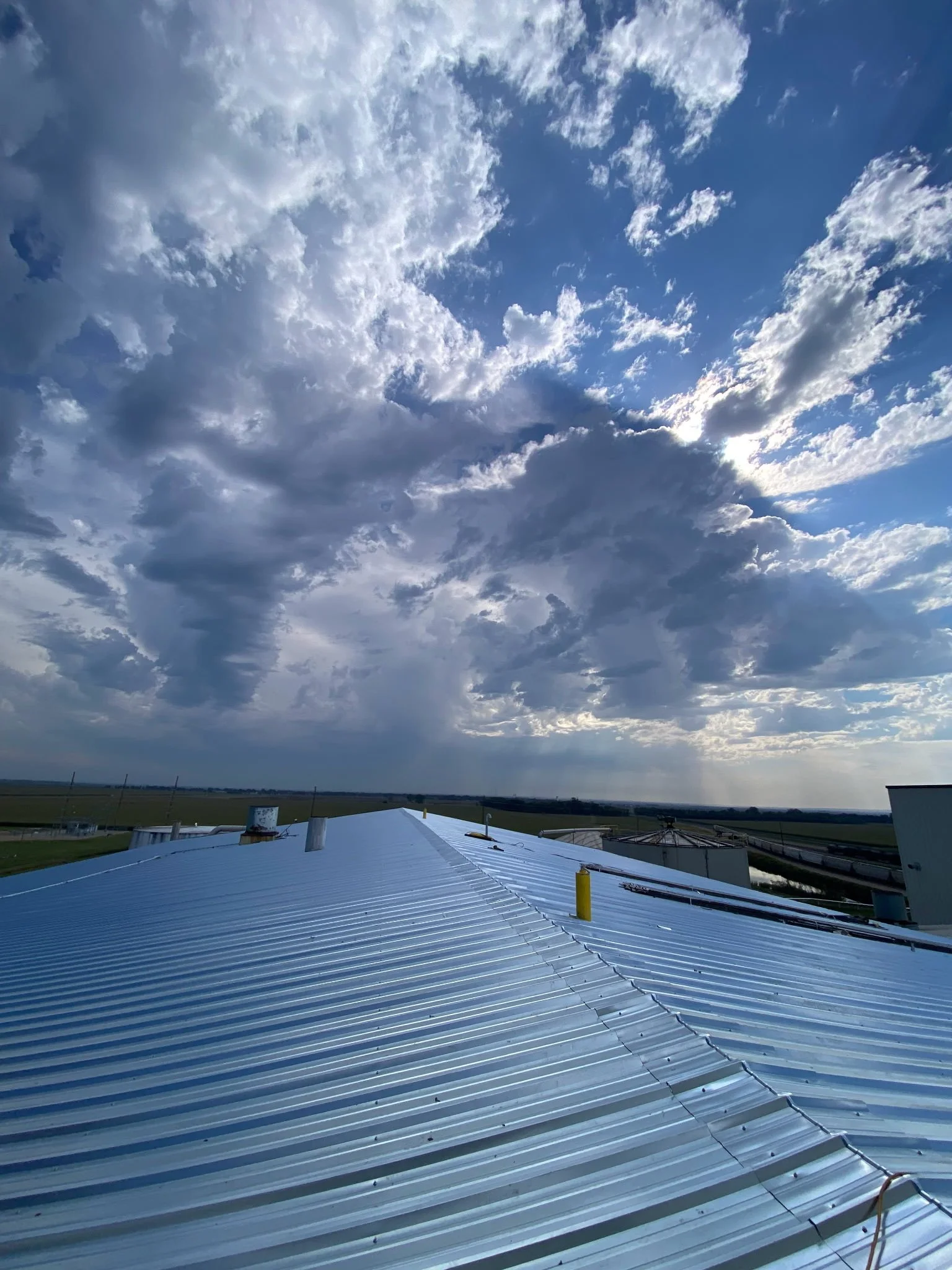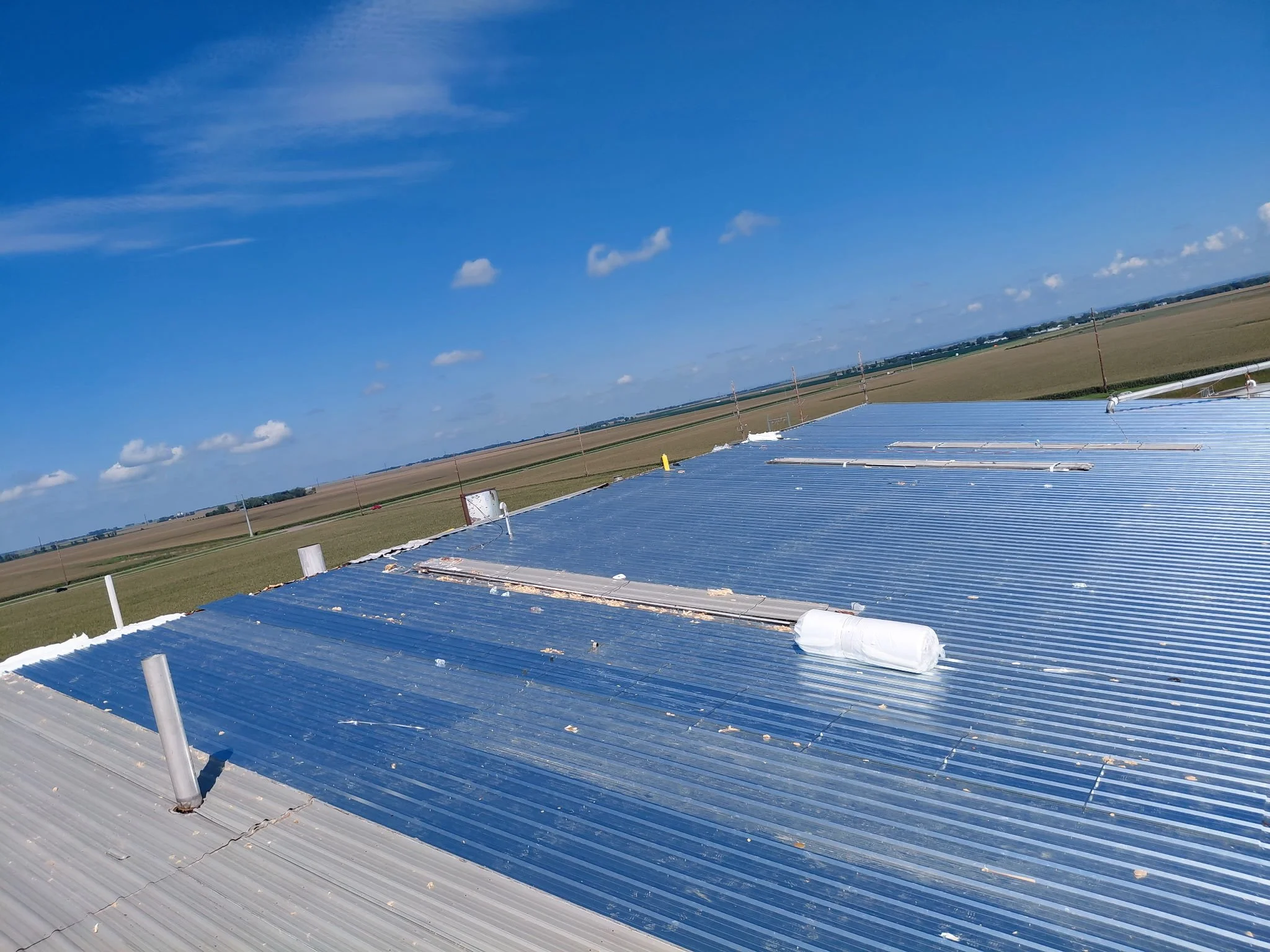 Full roof replacement including new insulation, new PBR paneling, ridge caps, and safety tie off posts fabricated and installed by Lundin Construction.